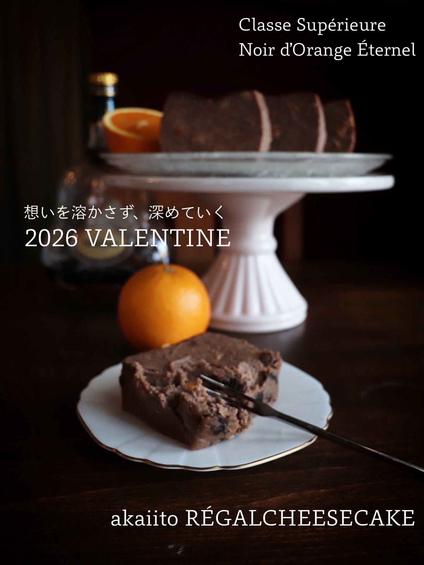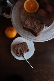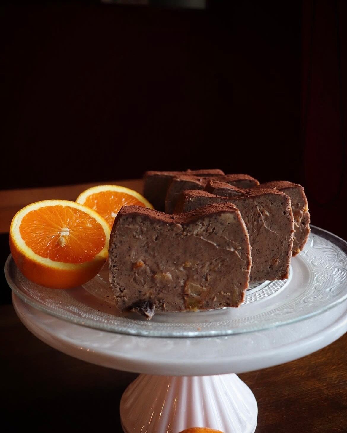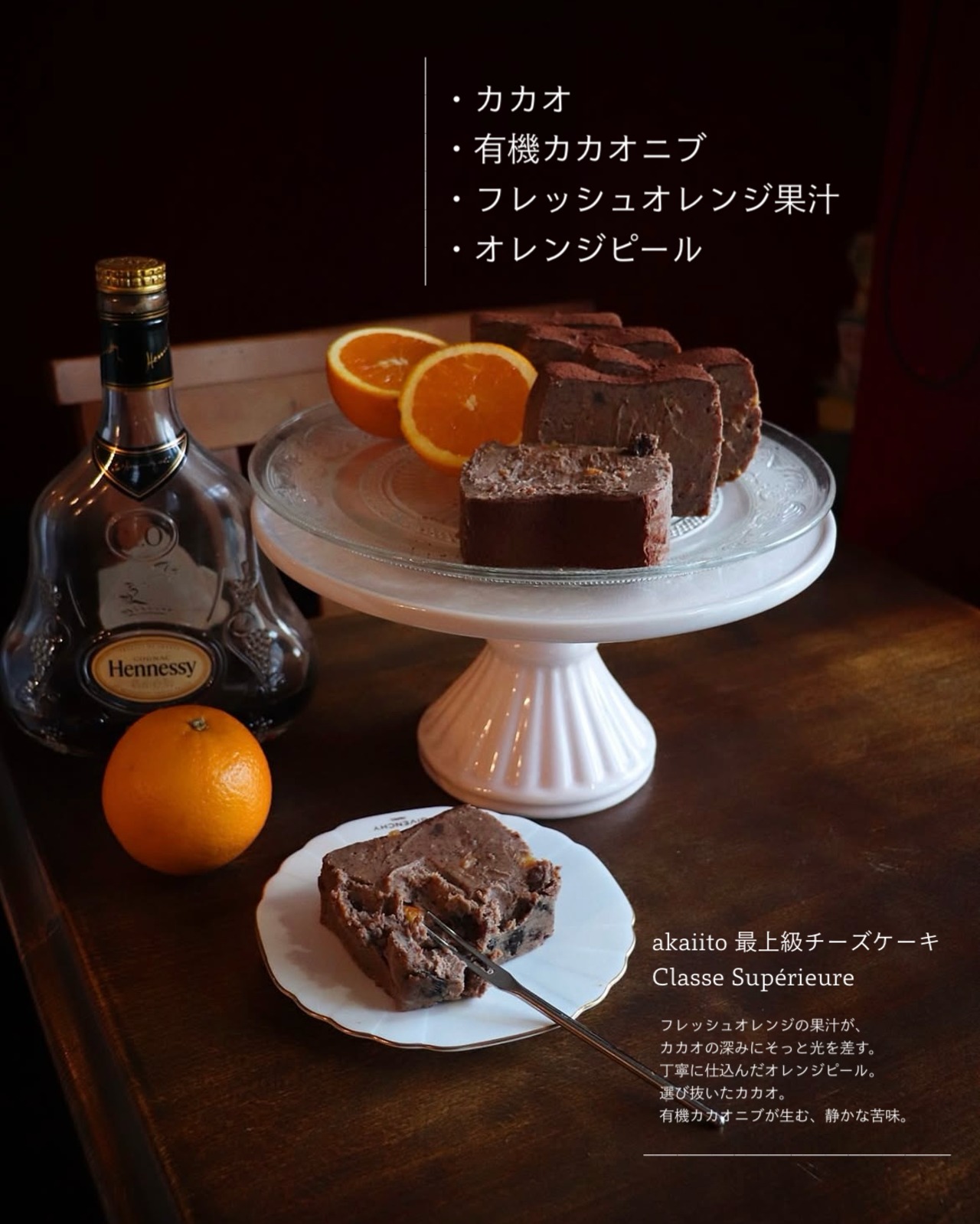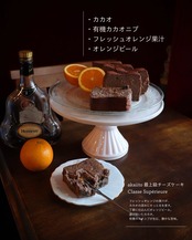 (カカオ、有機カカオニブ、フレッシュオレンジ果汁、オレンジピールのショコラチーズケーキ)